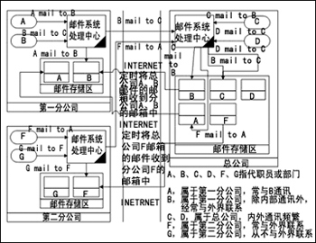 · F mail to A:F發(fā)郵件給A,此郵件經(jīng)由Internet發(fā)到總公司A的信箱中,因為域名是被解釋到總公司的服務(wù)器上,第一分公司的服務(wù)器會定時將總公司A信箱中的郵件取回,所以對A來講,F(xiàn)發(fā)來的郵件就好像是直接遞送到本公司的服務(wù)器上一樣。