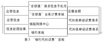 “銀行代扣話費(fèi)”方式 對(duì)于“由非銀行端發(fā)起,但需銀行代扣收的交易”,其執(zhí)行通過多種接入方式(如手機(jī)短消息、GPRS、客戶服務(wù)中心、自助終端、因特網(wǎng)等)提交信息,內(nèi)容包括“全球通”手機(jī)號(hào)、“神州行”手機(jī)號(hào)、IP電話卡號(hào)、付費(fèi)金額、銀行賬戶、密碼、交易類型等。