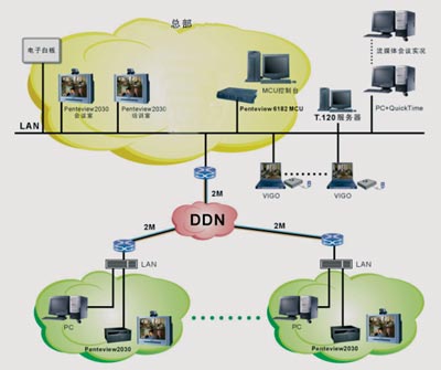 在上述網(wǎng)絡(luò)結(jié)構(gòu)中,還可以方便地繼續(xù)發(fā)展第三級視頻會議子網(wǎng)。正如前面提到的,這個(gè)第三級子網(wǎng)中,完全可以使用普通視頻會議終端,以節(jié)約大量費(fèi)用。