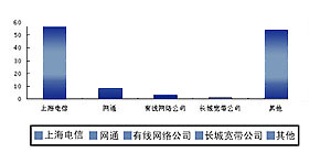 在國(guó)內(nèi),視訊市場(chǎng)的形成已經(jīng)初露端倪,眾多商家都開(kāi)始瞄準(zhǔn)這個(gè)新的利潤(rùn)增長(zhǎng)點(diǎn)。2002年8月,上海電信正式將視訊業(yè)務(wù)命名為“新視通”,并陸續(xù)開(kāi)通了上海至美國(guó)洛杉磯、新疆烏魯木齊、石河子、克拉瑪依等地區(qū)的公眾視訊業(yè)務(wù),同時(shí)還針對(duì)商用客戶和個(gè)人用戶啟動(dòng)了推廣計(jì)劃。由于上海是我國(guó)的貿(mào)易、金融、經(jīng)濟(jì)中心,許多國(guó)內(nèi)外的大型企業(yè)都在上海設(shè)有分支機(jī)構(gòu),市場(chǎng)潛力不可估量,眾多運(yùn)營(yíng)商都在爭(zhēng)取上海的市場(chǎng)。目前,除了上海電信推出的“新視通”業(yè)務(wù)外,網(wǎng)通、有線網(wǎng)絡(luò)和其它公司都在上海推出了自己的視訊系統(tǒng)。根據(jù)我們對(duì)企業(yè)用戶的抽樣調(diào)查,下圖的市場(chǎng)占有率表明了視訊業(yè)務(wù)的競(jìng)爭(zhēng)將會(huì)日益激烈。
