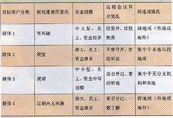 根據(jù)前一階段我們做的視訊業(yè)務(wù)市場(chǎng)研究,目前的主要目標(biāo)客戶可以定位為以下范圍:對(duì)于“新視通”會(huì)議系統(tǒng)感興趣的客戶,需要觀望的客戶以及雖然不感興趣但企業(yè)規(guī)模較大、存在著一定會(huì)議需求卻對(duì)遠(yuǎn)程會(huì)議不了解的客戶。通過(guò)對(duì)目標(biāo)群體的進(jìn)一步細(xì)分,我們將客戶聚類(lèi)為四個(gè)主要群體: