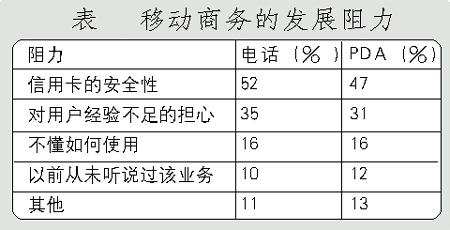 手機支付業(yè)務(wù)的進一步發(fā)展主要受制于用戶對該項業(yè)務(wù)的接受程度。Forrester研究公司的研究表明,超過一半的被訪者認為信用卡的安全性是移動商務(wù)發(fā)展的主要阻力。(調(diào)查結(jié)果見下表)