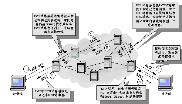 綜合服務(wù)和資源預(yù)留協(xié)議IntServ/RSVP:以RSVP信令向網(wǎng)絡(luò)提出業(yè)務(wù)流傳輸規(guī)格(Flowspec),并建立和拆除傳輸路徑上的業(yè)務(wù)流狀態(tài)。主機和路由器節(jié)點建立和保持業(yè)務(wù)流狀態(tài)信息。盡管RSVP經(jīng)常用于單個流,但也用于聚流的資源預(yù)留。