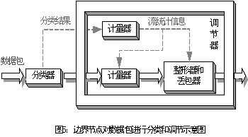 為了使用戶數(shù)據(jù)流符合SLA和TCA,邊界節(jié)點要對其進行分類和調(diào)節(jié),因而從功能上可以分為兩個模塊:分類器(classifier)和調(diào)節(jié)器(conditioner),如圖5所示。