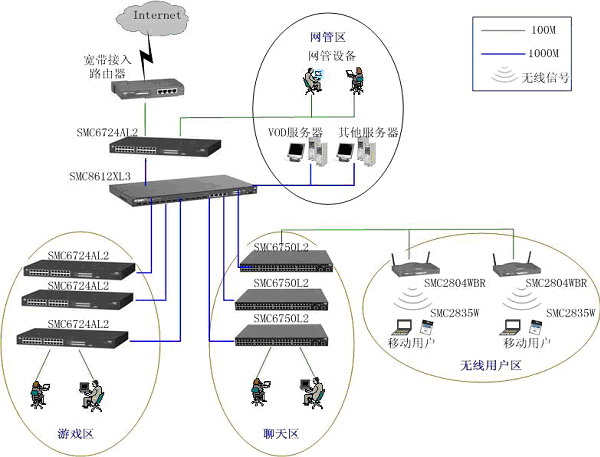 本方案采用"千兆光纖干線,百兆交換到桌面"的設(shè)計(jì)思路,各骨干線路均為1000M。骨干網(wǎng)通過高速線路接入INTERNET,網(wǎng)吧內(nèi)實(shí)現(xiàn)主干千兆交換、百兆到點(diǎn),整個(gè)網(wǎng)吧內(nèi)實(shí)現(xiàn)無阻塞通信。根據(jù)顧客的不同消費(fèi)需求,將網(wǎng)吧分為了網(wǎng)絡(luò)游戲區(qū)、聊天區(qū)、貴賓區(qū)等,根據(jù)不同區(qū)域的特點(diǎn),細(xì)化了不同網(wǎng)絡(luò)的解決方案。方案中采用的核心設(shè)備和二層設(shè)備都支持802.1Q標(biāo)準(zhǔn)VLAN和IGMP組播協(xié)議,為VOD、多媒體娛樂等豐富應(yīng)用的開展打下了堅(jiān)實(shí)的基礎(chǔ) 。通過劃分VLAN,MAC地址綁定來劃分了不同類型用戶,很好地滿足網(wǎng)吧的各項(xiàng)業(yè)務(wù)應(yīng)用需求。此外,SMC的豐富無線網(wǎng)絡(luò)產(chǎn)品可以很靈活的滿足網(wǎng)吧的組網(wǎng)需求,投資少、施工快。在提供高性能的同時(shí),還保證很好的安全性,既支持基于802.11b標(biāo)準(zhǔn)的安全機(jī)制,又支持動態(tài)安全鏈路,以及基于802.1x的增強(qiáng)性安全或認(rèn)證功能。