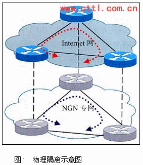 為了滿足NGN業(yè)務的不同需求,需要將NGN業(yè)務與Internet業(yè)務進行隔離,這種隔離可以是物理網(wǎng)絡的隔離,也可以是邏輯網(wǎng)絡的隔離。