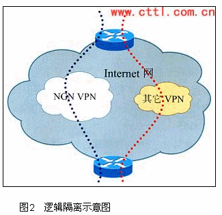 從圖2可以看出,邏輯隔離是在現(xiàn)有的運營商數(shù)據(jù)網(wǎng)基礎上,利用已經(jīng)比較成熟的VPN(如MPLSVPN)技術將網(wǎng)絡資源進行隔離:將網(wǎng)絡劃分為兩個邏輯子網(wǎng),一個是Internet業(yè)務子網(wǎng),另一個是NGN業(yè)務子網(wǎng)。兩個子網(wǎng)通過VPN進行隔離。NGN業(yè)務與Internet業(yè)務的區(qū)分在邊緣路由器PE上完成,PE根據(jù)物理接口或邏輯接口區(qū)分業(yè)務的類型,邏輯接口可以是VLAN,PVC等。在NGN子網(wǎng)中,再有針對的對QoS以及安全等問題進行解決。