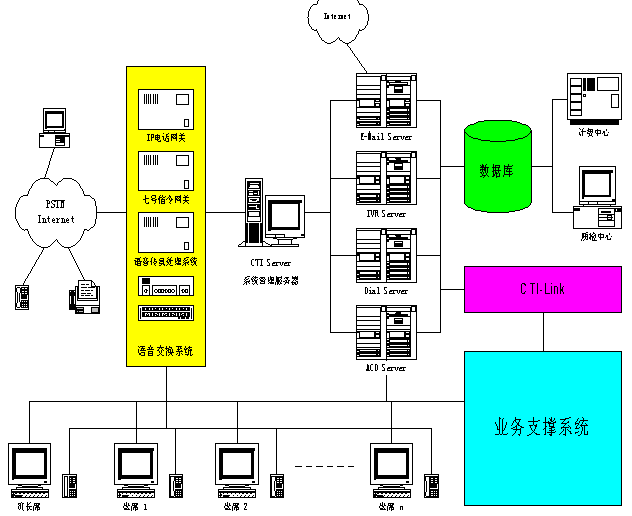 所述的電子郵件服務(wù)器(7)、交互式語(yǔ)音管理服務(wù)器(8)、撥號(hào)服務(wù)器(9)以及用于平均分配話務(wù)的語(yǔ)音系統(tǒng)分配服務(wù)器(10)均位于所述系統(tǒng)管理服務(wù)器(6)與數(shù)據(jù)庫(kù)(12)之間。所述的四個(gè)服務(wù)器(7~10)通過(guò)一個(gè)CTI業(yè)務(wù)接口(15)與業(yè)務(wù)支撐系統(tǒng)(16)連接。