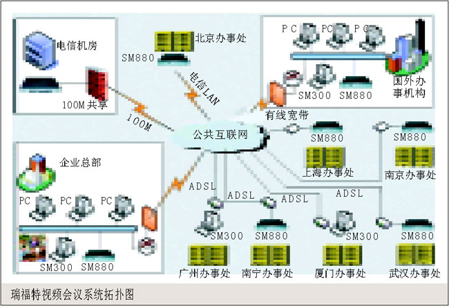 。。本系統(tǒng)中包含多個會場,使用瑞福特SM 880硬件終端,每個會場采用單獨的ADSL接入(也可采用其他接入方式),能夠保證發(fā)送與接收320×240、25