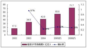 繼2004年中國政府和運(yùn)營商監(jiān)管力度的加大,2005年的短信SP市場規(guī)模增長率為32%,SP市場規(guī)模55.5億元,比2004年略有上升;谀壳岸绦攀袌鲈隽渴袌龅目s小,其增長主要依靠對存量市場需求的深度挖掘。諾盛預(yù)計(jì)2006年的短信市場繼續(xù)保持平穩(wěn)的增長勢頭,增長率將達(dá)29%。