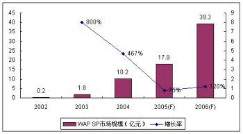 2005年中國運(yùn)營商對WAP沉默用戶的清理和一系列內(nèi)容監(jiān)管措施使得WAP市場前兩年的高速增長勢頭減緩,SP市場規(guī)模增長率下探至75%,規(guī)模達(dá)17.9億元。諾盛預(yù)計(jì)由于運(yùn)營商監(jiān)管政策的連續(xù)性及其對免費(fèi)WAP網(wǎng)站的政策調(diào)整,2006年的WAP市場仍然無法恢復(fù)2004年以前的高速增長勢頭,但增長率略有回暖,達(dá)到120%。