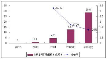 由于運(yùn)營商的監(jiān)管和增量市場需求的減少,2005年IVR高速增長的勢頭有所回落,市場增長速度趨于理性,SP市場份額增長率為170%,整體SP市場份額達(dá)到12.7億元。諾盛預(yù)計(jì)2006年IVR市場增長率將繼續(xù)回調(diào),但絕對增長率仍然較快,達(dá)到125%。