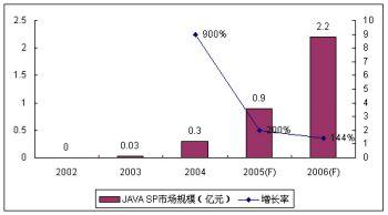 作為SP和移動(dòng)運(yùn)營商都非?春玫臉I(yè)務(wù),JAVA業(yè)務(wù)受到眾多SP的青睞。盡管作為JAVA主要業(yè)務(wù)的手機(jī)游戲目前盈利狀況普遍欠佳,但空中網(wǎng)、美通無線、數(shù)字魚等SP仍然大量投入,期待著未來業(yè)務(wù)的高速增長。受制于終端和JAVA游戲的表現(xiàn)力,2005年JAVA業(yè)務(wù)的SP市場規(guī)模增長率回落到200%,諾盛預(yù)計(jì)2006年JAVA的使用環(huán)境沒有太大變化,其增長率進(jìn)一步回落至144%。