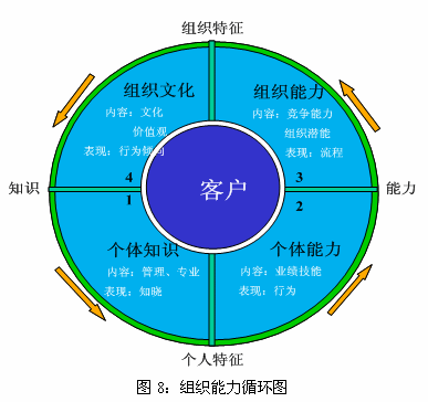 組織能力循環(huán)圖說明,管理者不僅要關(guān)注對(duì)組織中個(gè)體層次特性的管理,如個(gè)體知識(shí)、個(gè)體能力,更要關(guān)注組織層次特性的管理,如組織能力和企業(yè)文化。只有管理者將目光由個(gè)體能力轉(zhuǎn)向組織能力時(shí),即更注重組織層次的能力建設(shè)時(shí),組織才會(huì)真正地成長(zhǎng)和發(fā)展。