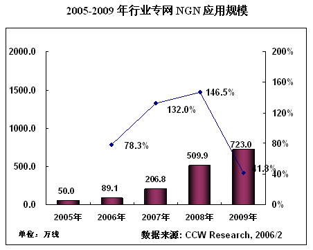 在運(yùn)營商N(yùn)GN建設(shè)高速增長的同時(shí),政府、能源、交通等行業(yè)專網(wǎng)NGN建設(shè)也逐漸步入快車道。NGN在行業(yè)專網(wǎng)的應(yīng)用,到2005年底的應(yīng)用規(guī)模達(dá)到50萬線,根據(jù)計(jì)世資訊(CCW Research)《2005-2006中國NGN產(chǎn)業(yè)應(yīng)用趨勢研究報(bào)告》的預(yù)測,未來4年,NGN在行業(yè)專網(wǎng)市場將以95%的復(fù)合增長率高速增長。