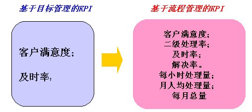 - 基于目標(biāo)的KPI不一定和流程相聯(lián)系,而基于流程的KPI一定是和流程相聯(lián)系的,基于流程的任一KPI一定有相應(yīng)的流程來(lái)保證其實(shí)現(xiàn)。如以前沒(méi)有人明確知道“接通率”是和哪一個(gè)流程相聯(lián)系的,該指標(biāo)是由哪一個(gè)流程來(lái)保證實(shí)現(xiàn)的。