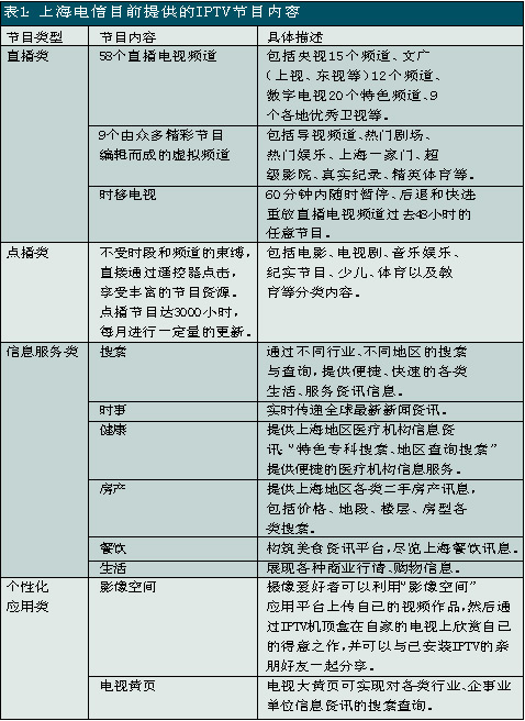 上海電信是國內(nèi)關(guān)注并切入IPTV業(yè)務(wù)較早的電信運營商之一,自2005年就開始積極測試和試驗。此次上海電信在全上海市范圍內(nèi)推出IPTV業(yè)務(wù),被業(yè)界看作是“中國IPTV規(guī)模商用的新紀(jì)元”。除了影視節(jié)目收看、視頻內(nèi)容點播、時移功能外,上海電信的IPTV服務(wù)還包括時事新聞、遠程醫(yī)療、視頻房產(chǎn)信息、餐飲信息、天氣預(yù)報、票務(wù)查詢等信息服務(wù)以及可視電話、IPTV游戲等個性化應(yīng)用。其中IPTV的直播頻道有58個,視頻點播可選節(jié)目量達3000小時以上。另外,上海電信還推出了影像空間和電視大黃頁等應(yīng)用服務(wù),攝像愛好者可以利用“影像空間”應(yīng)用平臺上傳自己的視頻作品,然后通過IPTV機頂盒在自家的電視上欣賞自己的得意之作,并可以與已安裝IPTV的親朋好友一起分享;電視大黃頁可實現(xiàn)對各類行業(yè)、企事業(yè)單位信息資訊的搜索查詢。