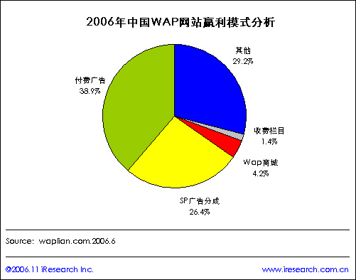 根據(jù)waplian.com統(tǒng)計數(shù)據(jù)顯示,2006年中國WAP網站贏利模式分析情況,付費廣告和SP廣告分成是WAP網站贏利模式的最主要兩種形式,比例分別為38.9%和26.4%,另外WAP商城和收費欄目的贏利模式也占一定份額比例,分別為4.2%和1.4%。
