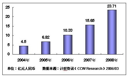 我國移動(dòng)電子政務(wù)已經(jīng)進(jìn)入高速發(fā)展時(shí)期:2005年的市場(chǎng)規(guī)模達(dá)6.82億元,增長率為51.6%;2006年將達(dá)到10.33億元。預(yù)計(jì)未來三年內(nèi),我國移動(dòng)電子政務(wù)復(fù)合增長率將達(dá)到51.5%,截至2008年,市場(chǎng)規(guī)模將突破20億元。