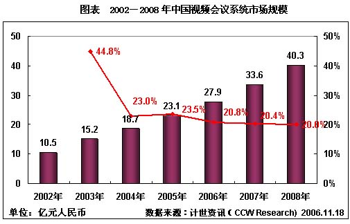 在2003年的井噴式發(fā)展之后,視頻會(huì)議系統(tǒng)市場發(fā)展速度開始進(jìn)入低速發(fā)展階段,市場逐漸出現(xiàn)飽和的趨勢。計(jì)世資訊(CCW Research)最新視頻會(huì)議報(bào)告數(shù)據(jù)顯示,從2003年非典時(shí)期視頻會(huì)議市場井噴式發(fā)展之后,2006年視頻會(huì)議系統(tǒng)的增長率開始下降,如何開發(fā)新的產(chǎn)品,成為視頻會(huì)議系統(tǒng)市場繼續(xù)發(fā)展的關(guān)鍵。而3G商用的到來,由此產(chǎn)生的移動(dòng)視頻業(yè)務(wù)也必將成為未來移動(dòng)通信新的市場增長點(diǎn),可以說,移動(dòng)信息化建設(shè)將為視頻會(huì)議系統(tǒng)開拓一片新的藍(lán)海。