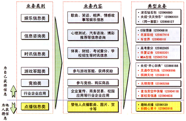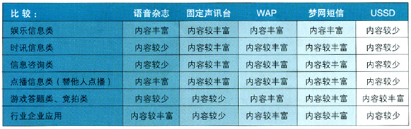 - 時(shí)訊信息類和信息咨詢類業(yè)務(wù),IVR優(yōu)勢(shì)較強(qiáng),但業(yè)務(wù)范圍較窄,內(nèi)容較少,收入貢獻(xiàn)較低,同時(shí)部分業(yè)務(wù)容易受到SP信息源的制約。如果能進(jìn)一步完善服務(wù),滿足用戶需求,業(yè)務(wù)將迅速發(fā)展,應(yīng)該定位于IVR短期發(fā)展的重點(diǎn)業(yè)務(wù)。