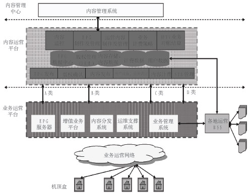 IPTV業(yè)務(wù)對系統(tǒng)運(yùn)行、管理、網(wǎng)絡(luò)的要求都非常高,因而必須采用分布式結(jié)構(gòu)來進(jìn)行部署。從部署層次來分,可分為內(nèi)容管理中心、內(nèi)容集成運(yùn)營平臺(tái)、業(yè)務(wù)支撐平臺(tái)。