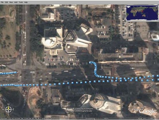 下圖顯示的是在中國深圳市進行汽車試駕時的GPS數(shù)據(jù),利用的是Google earth應用程序。圖中的每一個藍點代表一個GPS讀數(shù)。這些點在每隔一秒的時間內(nèi)讀出,因此,連續(xù)點之間的距離就代表著汽車的速度。我們甚至可以看見汽車駛?cè)氪髽堑耐\噲觥?br />