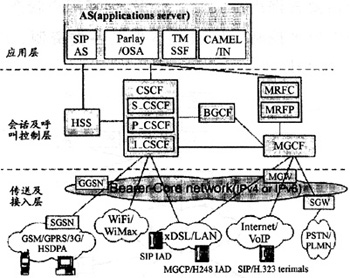 一般IMS分為三層,應(yīng)用層支持各類應(yīng)用服務(wù)器,負(fù)責(zé)為用戶提供增值業(yè)務(wù)和第三方業(yè)務(wù)。會話及呼叫控制層負(fù)責(zé)管理呼叫或會話設(shè)置,其中呼叫會話控制模塊CSCF完成呼叫網(wǎng)關(guān)功能、呼叫業(yè)務(wù)觸發(fā)功能和路由選擇功能,將SIP信令消息正確地轉(zhuǎn)發(fā)到應(yīng)用服務(wù)器。歸屬用戶服務(wù)器HSS用于維護(hù)每個終端用戶獨有的業(yè)務(wù)屬性,包括IP地址、漫游信息、好友列表、呼叫業(yè)務(wù)定制信息及語音郵件設(shè)置等。HSS是全網(wǎng)可用資源。媒體資源功能MRF包括MRFP和MRFC,負(fù)責(zé)提供及控制媒體流資源,如播放通知音、媒體流的混合、編解碼等。媒體網(wǎng)關(guān)控制MGCF負(fù)責(zé)PSTN承載與IP流之間的連接,根據(jù)被叫號碼和來話情況選擇CSCF,并完成PSTN與IMS之間的呼叫控制協(xié)議轉(zhuǎn)換,如將從CSCF接收到的SIP消息轉(zhuǎn)換為MEGACO或ISUP消息,并通過IP發(fā)送到信令網(wǎng)關(guān)SGW。出口網(wǎng)關(guān)控制功能BGCF主要實現(xiàn)呼叫路由功能,為呼叫選擇適當(dāng)?shù)腜STN接口點,若發(fā)現(xiàn)該接口點與自己在同一網(wǎng)絡(luò),則選擇本網(wǎng)絡(luò)的MGCF與PSTN交互,若發(fā)現(xiàn)接口點在另一網(wǎng)絡(luò)時,BGCF將會話信令轉(zhuǎn)發(fā)給另一網(wǎng)絡(luò)相應(yīng)的BGCF。一個IMS可以包含一個或多個CSCF、HSS、MGCF等功能模塊。傳送及接入層承載各種類型之間的轉(zhuǎn)換,完成與傳統(tǒng)PSTN/PLMN間的互通等功能,包括各類有線接入、無線接入、互聯(lián)互通網(wǎng)關(guān)等設(shè)備。