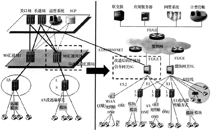 改造后的匯接局和端局之間通過ISUP中繼方式連接,接入網(wǎng)絡通過V5中繼接入。如果原有匯接局直接下掛部分用戶,這部分用戶可以采用中繼媒體網(wǎng)關下掛接入單元的方式接入。原有端局用戶的數(shù)據(jù)管理和業(yè)務提供統(tǒng)一由軟交換支持,端局用戶的業(yè)務觸發(fā)提升到匯接局,避免對端局的改造,同時,用戶可以使用軟交換業(yè)務平臺提供的各類智能業(yè)務和增值業(yè)務。匯接局網(wǎng)絡優(yōu)化后,原有端局無法提供的業(yè)務均可以由軟交換業(yè)務系統(tǒng)提供。