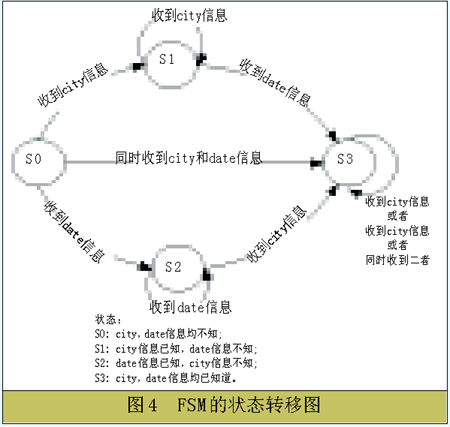 在總結(jié)了前人工作經(jīng)驗和結(jié)合本系統(tǒng)的實際問題的基礎上,我們在對話管理的具體實現(xiàn)上,將框架理論和有限狀態(tài)自動機理論相結(jié)合,完成了一個智能的對話管理模塊。我們先將對話管理限制在天氣查詢領域。在系統(tǒng)中,通過人機之間的對話和確認,系統(tǒng)需要得到要查詢的時間和地點信息之后反饋查詢結(jié)果。
