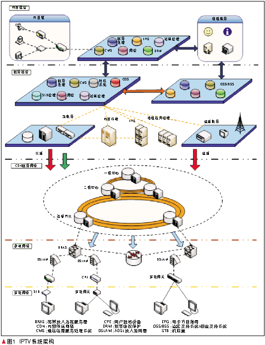 圖1所示為IPTV系統(tǒng)架構(gòu)。IPTV通用系統(tǒng)的邏輯結(jié)構(gòu)由內(nèi)容運營平臺、業(yè)務(wù)運營平臺、內(nèi)容傳送(CDN)業(yè)務(wù)網(wǎng)絡(luò)、承載網(wǎng)絡(luò)、家庭網(wǎng)絡(luò)5部分所構(gòu)成。