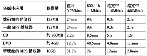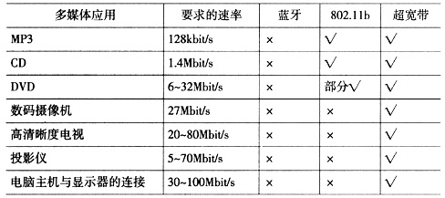 2.0接口相當(dāng),遠(yuǎn)遠(yuǎn)高于無線局域網(wǎng)802.11b的11 Mbit/s,也比下一代無線局域網(wǎng)802.11a/g的54 Mbit/s高出近一個數(shù)量級。UWB通信的功耗較低,能更好地滿足使用電池的移動設(shè)備的要求。另外,UWB信號的功率譜密度非常低,信號難以被檢測到,再加上采用的跳頻、直接序列擴頻等擴頻多址技術(shù),使非授權(quán)者很難截獲傳輸?shù)男畔ⅲ蚨踩苑浅:。?是一些典型的實時多媒體應(yīng)用對不同無線傳輸技術(shù)的數(shù)據(jù)傳輸速率的要求。從表中可以看出,如果采用無線的方式來進行傳輸,只有UWB技術(shù)可以滿足各種應(yīng)用的要求。