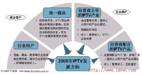 2008年,IPTV市場,因為發(fā)展速度明顯慢于了市場進度和技術(shù)演進。因此在原有的運營商產(chǎn)業(yè)化推動形勢下,終端廠家推動下的產(chǎn)品化發(fā)展模式也會得到更大的發(fā)展空間,而這在一定程度上雖會推動用戶對IPTV的認(rèn)知度,同時也會分化一部分IPTV產(chǎn)業(yè)化的動力。