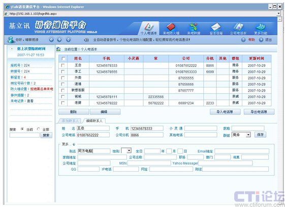 電話(huà)本查詢(xún)功能允許員工從任何一臺(tái)電話(huà)機(jī)(企業(yè)內(nèi)部或者外部電話(huà)都可以)查詢(xún)自己的電話(huà)本中聯(lián)系人信息。該功能對(duì)于出差在外管理人員,緊急時(shí)如果要查詢(xún)某客戶(hù)資料信息特別有用。例如,可以查詢(xún)客戶(hù)姓名、電話(huà)號(hào)碼、地址等等。