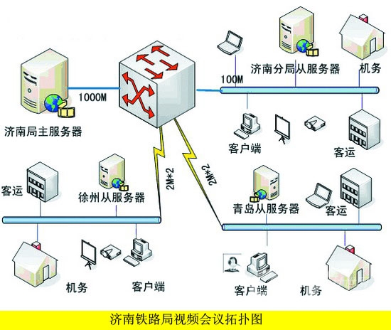 由于路局改革后組織結(jié)構(gòu)的特點(diǎn),決定了跨地域會(huì)議較多,如濟(jì)南和徐州、青島之間召開的部門級別的會(huì)議比較頻繁,加上三地之間的帶寬制約,本方案采用了主從服務(wù)器的系統(tǒng)架構(gòu),1主3從,主服務(wù)器設(shè)置在路局網(wǎng)絡(luò)中心,原來濟(jì)南分局位置設(shè)置1臺(tái)從服務(wù)器,負(fù)責(zé)濟(jì)南地區(qū)的內(nèi)部會(huì)議,以及與其他2地的遠(yuǎn)程會(huì)議,同樣徐州、青島也各設(shè)置1臺(tái)從服務(wù)器。
