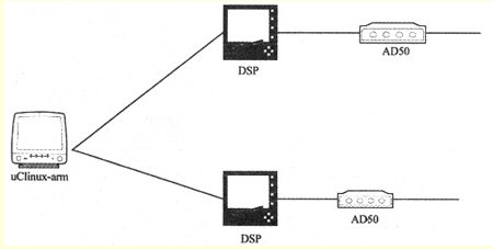 下一代媒體網(wǎng)關(guān)系統(tǒng)主要由媒體網(wǎng)關(guān)、媒體網(wǎng)關(guān)控制器和信令網(wǎng)關(guān)組成,實(shí)現(xiàn)了功能上的分解。為了適應(yīng)不同的網(wǎng)絡(luò),本文主要介紹了媒體網(wǎng)關(guān)的實(shí)現(xiàn)方法,其中媒體網(wǎng)關(guān)的主要作用是實(shí)現(xiàn)模擬信號由電路交換轉(zhuǎn)換成數(shù)字信號PCM編碼,并進(jìn)行G.711或者G.723等格式編碼。為了實(shí)現(xiàn)媒體網(wǎng)關(guān),整個系統(tǒng)由3部分組成,包括基于ARM架構(gòu)的嵌入式系統(tǒng)(uClinux)、語音信號轉(zhuǎn)換芯片(TLC320AD50)和定點(diǎn)數(shù)字信號處理器(TMS320VC54xx),如圖3所示。