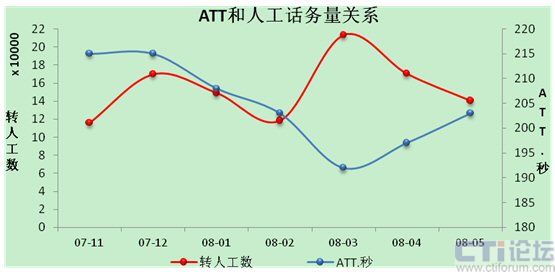 請(qǐng)先看月度ATT和人工話務(wù)量的關(guān)聯(lián)圖:(圖2)
