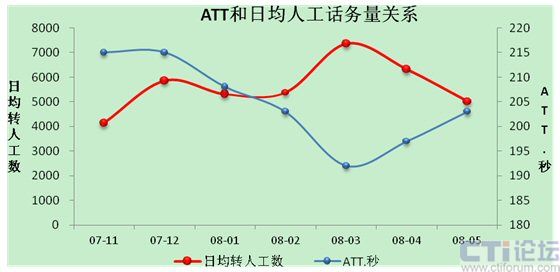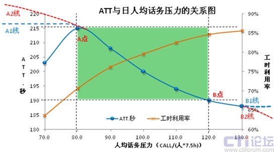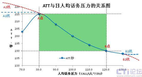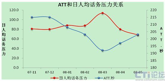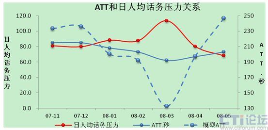 1. 人均話務(wù)壓力在80~120區(qū)間,ATT在215~190呈線性下降;