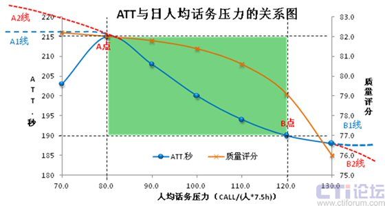 2. 人均話務(wù)壓力在80以下,ATT并沒有依線性進(jìn)一步增大,而是從215秒“扭頭”下降,說明ATT受到了某種有效制約;
