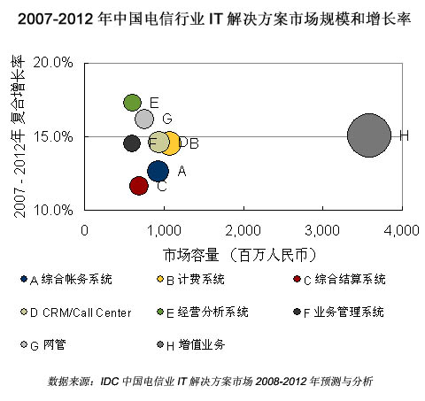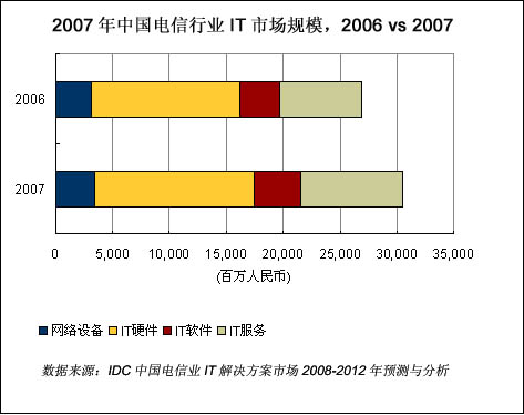 IDC《中國電信行業(yè)IT解決方案市場2008-2012年預測與分析》報告的數(shù)據(jù)顯示,2007年中國電信行業(yè)整體IT支出規(guī)模為305.02億元人民幣,比2006年增長了13.2%。2007年電信行業(yè)IT運營支撐系統(tǒng)和增值業(yè)務系統(tǒng)的高速增長主要是由于運營商都在為3G的實施和全業(yè)務運營做準備。