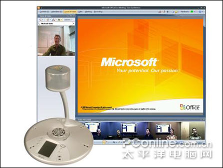 微軟Office RoundTable,音頻-視頻協(xié)作設(shè)備,帶有一個獨特的 360 度相機。在結(jié)合 Office Communications Server 2007 使用時,RoundTable 還可交付卓越的會議體驗:將會議環(huán)境擴展到多個位置,F(xiàn)場及遠程位置的與會人員可以全景查看會議室中的每位成員,還可以在輪流發(fā)言時拉近特寫某個與會者。