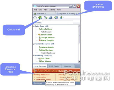 Sametime Advanced的即時共享功能使用戶能夠啟動屏幕或應用分享會話,并支持其他參與者“驅(qū)動”并修改文檔。此外,用戶還能夠事先安排同事的位置,突出顯示用戶位置和離線聯(lián)系人上次出現(xiàn)的位置,節(jié)約時間和精力。