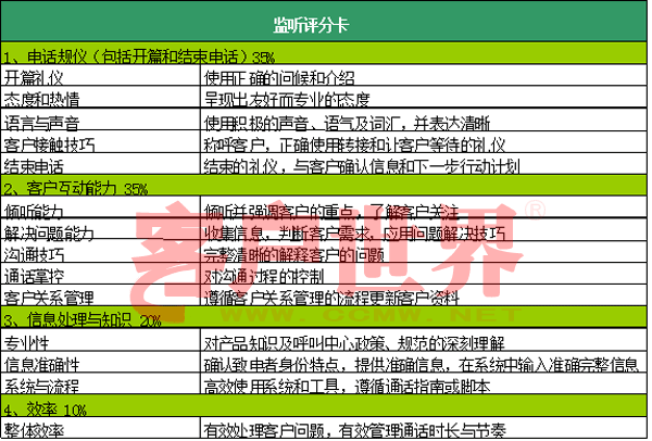b.一個不可忽視的工作是對表中的各項進(jìn)行嚴(yán)格定義,然后訓(xùn)導(dǎo)師與主管、培訓(xùn)、質(zhì)檢師根據(jù)共同的錄音資料反復(fù)“核對筆記”,取得共識,并將樣本打分結(jié)果發(fā)給座席代表溫習(xí)。