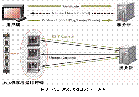 Media Server等業(yè)界常見的視頻服務(wù)器互通并提供性能測試。圖3是VOD服務(wù)器交換過程與IXIA進(jìn)行性能測試示意。