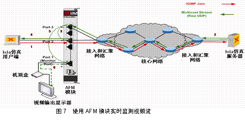另外一種常見的應(yīng)用場景是對網(wǎng)絡(luò)中存在的IPTV組播流和單播流能夠進(jìn)行被動實時監(jiān)測并能夠評估相應(yīng)視頻流的視頻質(zhì)量。IXIA獨特的視頻流提取模塊AFM支持該特性的測試(見圖6)。