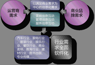 基于這個(gè)需求,那么運(yùn)營(yíng)商更需要的是針對(duì)行業(yè)版的解決方案,有許多的行業(yè)正在期待獲得這樣的商業(yè)信息化平臺(tái),包括:汽車(chē)行業(yè)、家電行業(yè)、服裝行業(yè)、娛樂(lè)行業(yè)、餐飲行業(yè)、商業(yè)賣(mài)場(chǎng)、教育行業(yè)、建材行業(yè)、圖書(shū)出版、專業(yè)傳媒等。