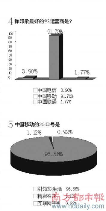1、中國移動的3G口號是?超過98%的被訪者選擇了“引領(lǐng)3G生活”這一正確選項(xiàng)。2、你是否考慮升級到3G手機(jī)?選擇“會升級”的接近80%。如果考慮升級到3G手機(jī),你最想使用哪家運(yùn)營商的服務(wù)?中國移動奪得了超過九成的選票。但當(dāng)最后問到,“你印象中,中國移動的3G標(biāo)準(zhǔn)是?”時(shí),正確選項(xiàng)T D -SCD M A的得票率竟只有三成左右。