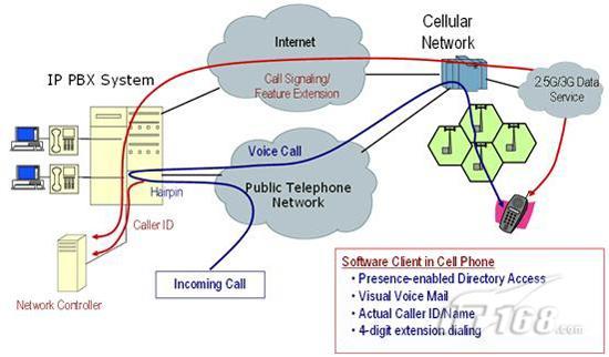 Sprint-Nextel最近推出了一種運(yùn)用Femtocells技術(shù)、類似cFMC的解決方案,稱為Airave。按照這個(gè)方案,用戶把蜂窩通信網(wǎng)絡(luò)的一個(gè)小型基站同基地的寬帶互聯(lián)網(wǎng)連接在一起。如圖1所示,這兩種方案都是利用寬帶互聯(lián)網(wǎng)和蜂窩通信網(wǎng)絡(luò)其中之一實(shí)現(xiàn)Voip,不同的區(qū)別只是本地的無線連接是運(yùn)用Wi-Fi技術(shù)還是蜂窩通信網(wǎng)絡(luò)。對(duì)企業(yè)用戶而言,主要缺點(diǎn)是,這兩種實(shí)現(xiàn)方式提供的都是由用戶主導(dǎo)的單一語音服務(wù),而沒有面向企業(yè)PBX或移動(dòng)UC系統(tǒng)的接口。