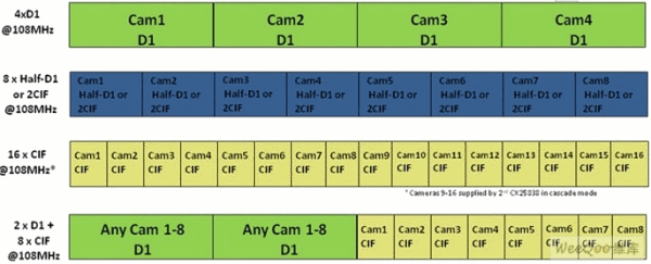 CX25838為監(jiān)控DVR設(shè)計人員提供機(jī)會,通過提供幀交錯數(shù)據(jù)實(shí)現(xiàn)編解碼器效率最大化,而不采用昂貴的FPGA或可編程邏輯。它還通過提供各種分辨率和幀速率,在一系列產(chǎn)品*享系統(tǒng)架構(gòu),提供規(guī)模優(yōu)勢的能力。例如,低成本DVR可采用一個編解碼器以全幀速率壓縮16個CIF分辨率通道,這可通過一條8位總線實(shí)現(xiàn)。其他解決方案可能需要每個編解碼器以全幀速率壓縮4個D1分辨率通道。還有些可能需要降低幀速率的D1