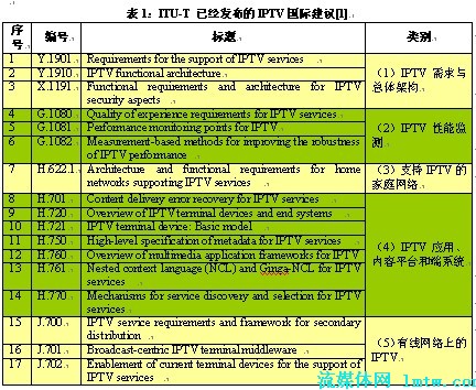 IPTV Forum)、日本IPTV論壇(IPTV FORUM JAPAN)等。ITU-T作為信息通信行業(yè)標(biāo)準(zhǔn)化的官方組織,自2006年就啟動了相關(guān)工作,除了自身完成了多項(xiàng)核心國際標(biāo)準(zhǔn)(國際建議)外,還在協(xié)調(diào)全球標(biāo)準(zhǔn)化活動方面發(fā)揮了重要作用。